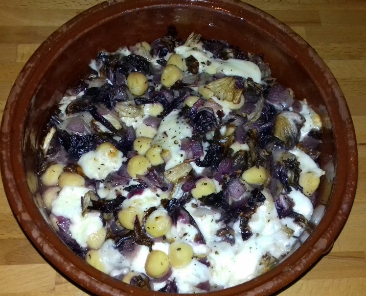 Chop and fry 4 garlic cloves and 2 red onions in a drizzle of olive oil. Add 700 grams of washed and chopped radicchio, 1 table spoon of dried badil and 1 small can of anchovies. Bake until just before being all dente. Add pepper. Mix with 250 grams of drained burrata or mozzarella. Put in an oiled dish. Cover and store in the fridge.