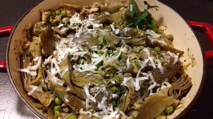 The artichokes season is getting towards the end. Today’s dish is a marriage between winter and spring, and thus between artichokes, fresh peas and beans.