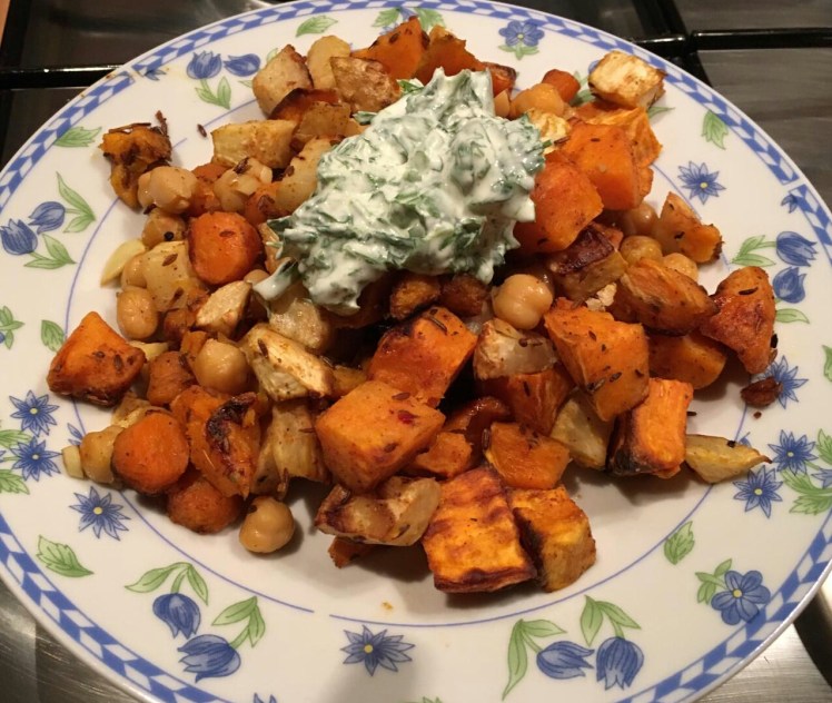 Clean 1 small celery ( 800 grams +/-). Chop in cubes and put on baking paper. Clean 1 sweet potato ( 600 grams ). Chop in cubes and put on baking paper. Clean 300 grams of carrots. Chop and put on the same oven tray on the baking paper. Add a good drizzle of olive oil, 1 table spoon of curry powder, 1 table spoon of cumin seeds. Bake in the oven at 200° for 40 mins. Stir and add 4 chopped garlic cloves. Continue the baking for another 20 mins. Taste, add pepper and salt.