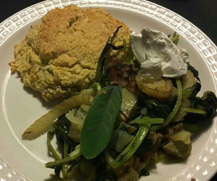 Serve with crispy oven baked fennel, onion, garlic and turnip tops and a few spoons of mascarpone.