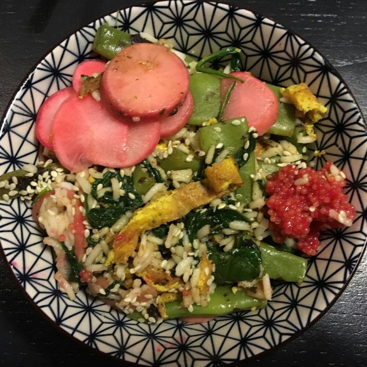 Spread rice, vegetables and egg in a nice bowl. Finish with some nori, sesame seeds, fish eggs, soy sauce and chopped parsley or coriander.