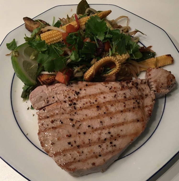 A grilled tuna steak is at its best with a mixture of stir fried vegetables.