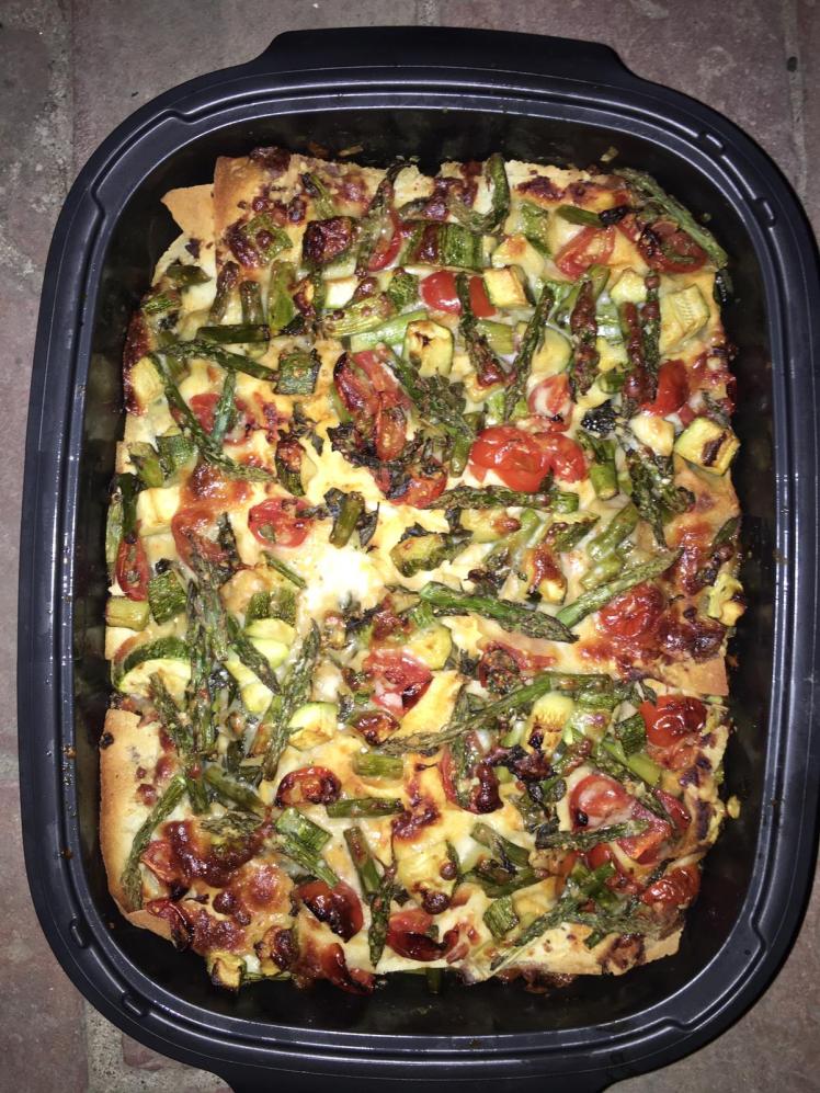 Chop and fry the garlic cloves and the chili in a drizzle of olive oil. Add the chopped asparagus ( keep the tender end to finish) and the chopped courgettes. Stir and bake. Add the tomatoes and a handful of chopped fresh basil and fresh oregano. Once al dente, stop the fire. Taste, add pepper and salt.