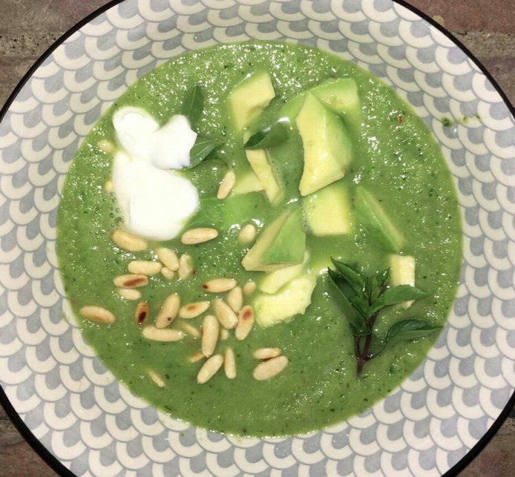 Put the soup in a nice cup. Spread some avocado and pine nuts. Finish with some sour cream and lemon basil leaves.