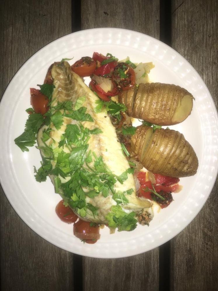 Put in the over at 200° for approximately 30 mins. Put 2 white fish filets on top. Put back in te oven for 10-15 mins. Finish with fresh parsley and lemon.