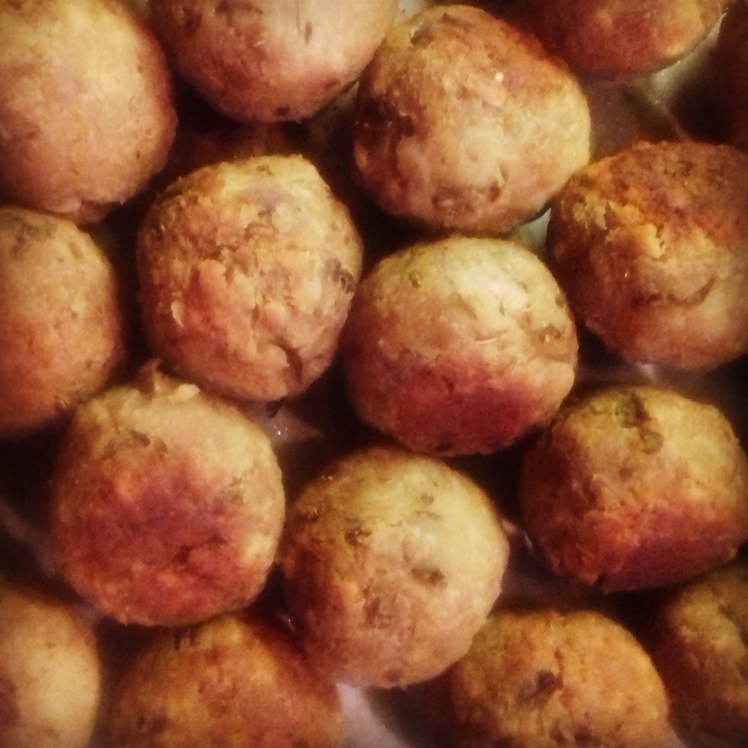 Put 100 grams of taralli ( those round grissini ) in a blender. Add 1 teaspoon of fennel seeds, the garlic, the capres and the tuna. Blend. Add 1 egg and 1 table spoon of Greek yoghurt. Taste, add pepper and salt.