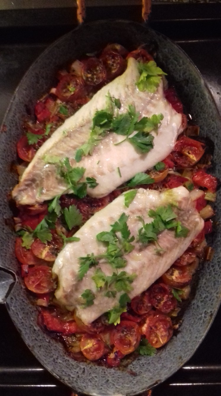 Stir the tomatoes. Put them on the side. Put the fish in the middle. Bake for 10 mins. Finish with fresh basil.