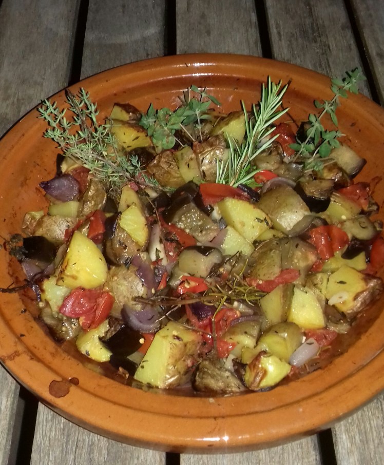 Chop 1 large eggplant and 4 mediumsized potatoes in large cubes. Add 4 chopped garlic cloves, 1 chili and 1 chopped large onion. Spread some fresh thyme, rosemary and oregano. Add a large drizzle of olive oil and mix everything. Put the oven dish in the oven at 200° for 40 mins. Stir halfway and add 3 chopped tomatoes. Add some extra baking time, if necessary, until the potatoes and tomatoes are ready.