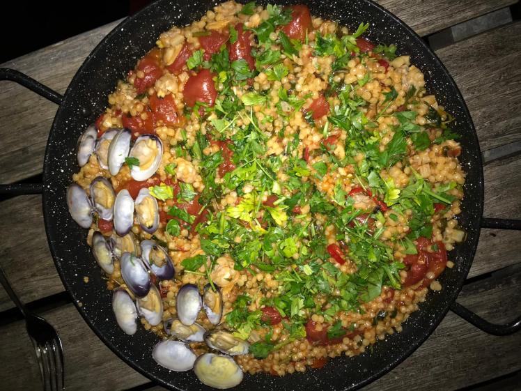 Remove the shells of the vongole and leave a few as decoration. Once the fregola is al dente, add the vongole. Taste, add pepper and salt. Finish with fresh parsley. Enjoy!