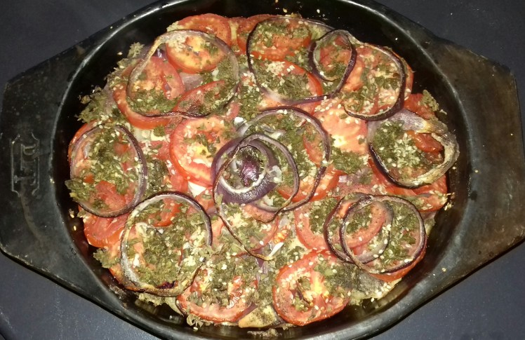 Oil a medium sized elegant oven dish. Slice 2 large potatoes thinly. Spread in the oven dish. Slice one large red onion, 4 garlic cloves and 2 large tomatoes thinly. Spread them on the potatoes.