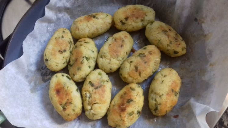 Create chubby croquettes with wet hands. Put the on baking paper. Spread some olive oil. Bake approx 30 mins in a hot oven at 200°. Turn halfway. ( Janneke bakes them in a pan).