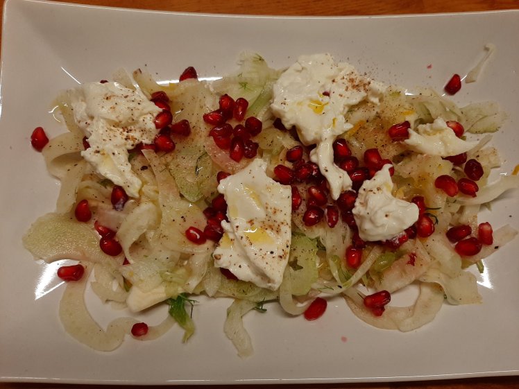Spread the fennel on 6 dishes. Spread the pomegranate seeds and the zeste of 1 lemon. Spread 300 grams of lucious burrata on the dishes. Add pepper, salt. Finish with some good olive oil.