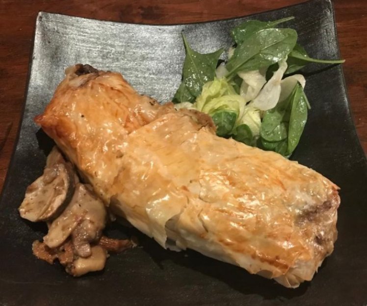 Brush some melted butter on filo pastry sheets. Use 3-4 sheets per strudel. Divide the mushrooms in portions. Make solid strudels. Put the on baking
