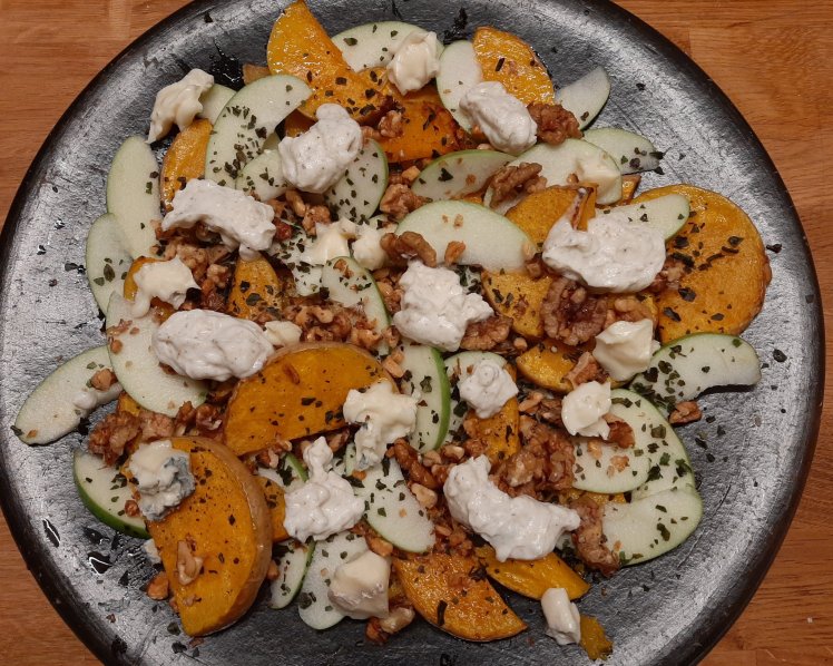 For 2p, cut 800 grams of a butternut in 1cm slices. Put in a large oven dish. Mix with 4 cm of chopped ginger, 4 chopped garlic cloves, 1 chopped chili and a drizzle of olive juice. Bake in the oven at 200° for approximately 30 mins. Turn the slices halfway. In the meanwhile, mix 50 ml of white wine vinegar with 1 table spoon of sugar. Add 2 table spoons of walnuts. Allow to cook. Stop the fire and cool down.