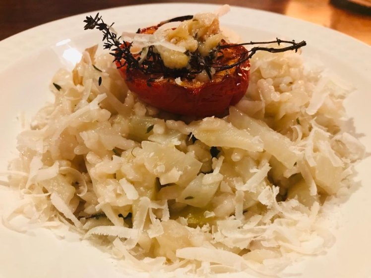 Chop 1 fennel and 1 onion. Fry in a mixture of olive oil and a teaspoon of butter. Add 120 grams of risotto rice and 1 tablespoon of dried thyme. Once glazy, add 75 ml of dry white wine and allow to evaporate. Stir regularly. Add ( homemade) vegetable stock cup by cup ( approx 500 ml) until the risotto is ready. Taste, add pepper and salt. Mix with a few tablespoons of grated parmesan. Serve with the tomato , the oven roasted garlic and grated parmigiano.