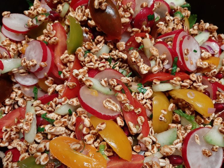 Roast 100 grams of puffed farro in a dry pan ( be careful, it easily burns). Mix with the vegetables. Finish with extra olive oil.