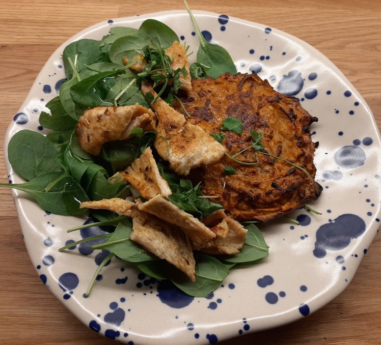 Serve the pancakes with a green salad, some maple syrup, crispy chicken filet seasoned with pepper, salt and cumin ( or a vegetarian variety),green salad and the last coriander of the season.