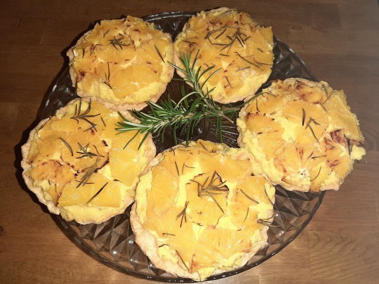 Mix 6 eggs, 2 egg yolks, 100 grams of sugar, the zeste of 1 orange, 100 ml of fresh orange juice, 1 table spoon of chopped rosemary in a small pan. Heat au bain marie. Stir constantly. Add 125 grams of butter in small portions. The mixture will start to thicken. Keep on doing this for approx 12 mins. Cool down, cover with cling film.