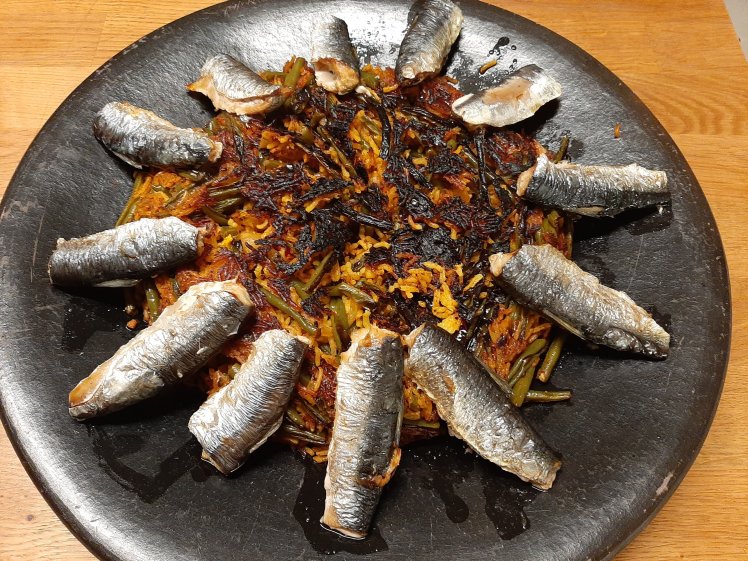 Spicy rice with green beans and tomato, or the classical combination with meat ‘loobia polow’ is delicious. Our loobia polow has grilled sardines as protein supplier.