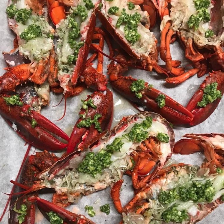 Fill a large pan with water and a cube of vegetable stock. Once the water is boiling, add the lobster ( approximately 750 grams each) one by one. Boil only for 1-3 mins ( depends on size). Cool down. Use a sharp knife to cut the lobsters in halves. Iris removes the greenish part from the head ( in certain recipes this part is used to prepare the sauce). Break the claws. Put the halves on a tray on baking paper. Spread the herbal butter.