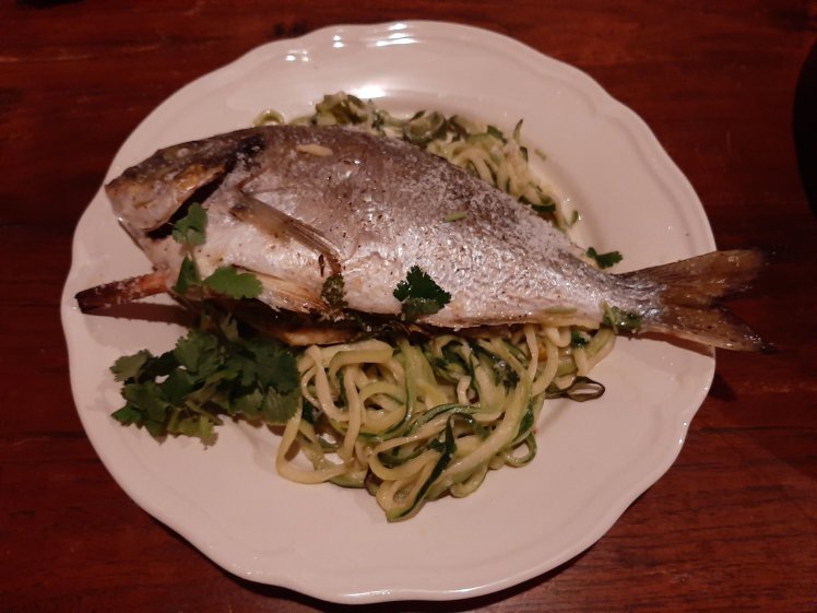 Serve the fish on the courgettes. Finish with a lot of fresh coriander and 1 table spoon of grated coconut.
