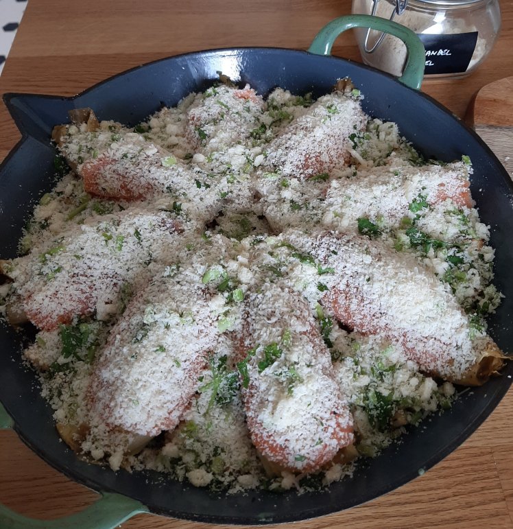 Mix 40 grams of grated parmigiano with 20 grams of almond flour, 3 table spoons of chopped fresh parsley, 4 chopped garlic cloves and a lot of pepper. Spread on the vegetables. Spread some butter.