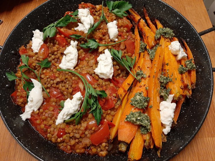 Serve carrots, lentils and tomatoes with the pesto, lucious burrata and some fresh parsley ( fresh coriander would be even better).