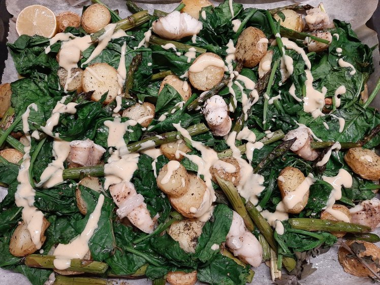 Yesterday I prepared the shopping list for a menu for 2 for 1week. A few things were not available, but I’ll manage to find some alternatives. Toilet paper seems not to be a problem here, but today I could not find any fresh eggs.Clean and chop 500 grams of potatoes. Put them on baking paper. Spread some olive oil. Bake in the oven at 180° for 20 mins. Clean 500 grams of green asparagus. Mix with the potatoes. Add 4 chopped garlic cloves and 1 teaspoon spoon of dried dill. Bake for another 15mins. Stir. Spread 300 grams of frozen monkfish. Bake for another 15 mins. Stop the oven, add 400 grams of fresh, shortly parboiled spinach, pepper and salt. Serve with a dressing of 2 tablespoons of dijon mustard, 2 table spoons of yoghurt, 2 teaspoons of honey, some lemon juice, pepper and salt.