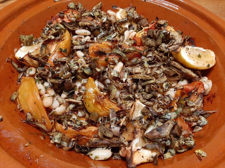A side dish for 4p or a main dish for 2p with a long lasting fabulous smell while cooking, and probably a possible ‘after smell’ in the following hours😏.Healthy food is often combined with some extra flatulence. For certain people it’s embarrassing, for other people it’s a perfect natural function of our intestines. Even being in quarantine, my advice is : just let it go, although warning your environment in case it happens is accepted as being more ‘polite’.Anyway, start the evening before. Soak 150 grams of dried white beans in a large amount of water for at least 8h. Drain. Put them back in the pan with a large amount of salted water, a few bay leaves and a drizzle of olive oil. Boil them until al dente ( approximately 40-60 minutes). Drain.In the meanwhile, slice 2 large tomatoes, preferably ‘coeur de boeuf’, in quarters. Slice 1 large untreated lemon in quarters. Put in an oven dish. Spread salt and olive oil. Roast in the oven at 180° for approximately 40-60 minutes.During the same time, clean 2 baby artichokes. Slice thinly. Chop and fry 4 garlic cloves in a drizzle of olive oil. Add the artichokes and 1 tablespoon of dried basil. Bake for 5-10 minutes until crispy. Add pepper. Store on a plate.Use the same pan. Pour 1 small can of anchovies and the oil of the can in the pan. Add 2 quarters of the oven roasted tomato. Melt on a low fire. Add 2 table spoons of cider of sherry vinegar (or more), 1 teaspoon of sweet paprika powder and a lot of black pepper. Mix with the beans and some fresh chopped parsley.Spread the beans and artichokes in between tomatoes and lemons. Serve. Squeeze the lemon juice on the ingredients.Perfect meal after a stormy day😉.