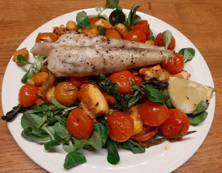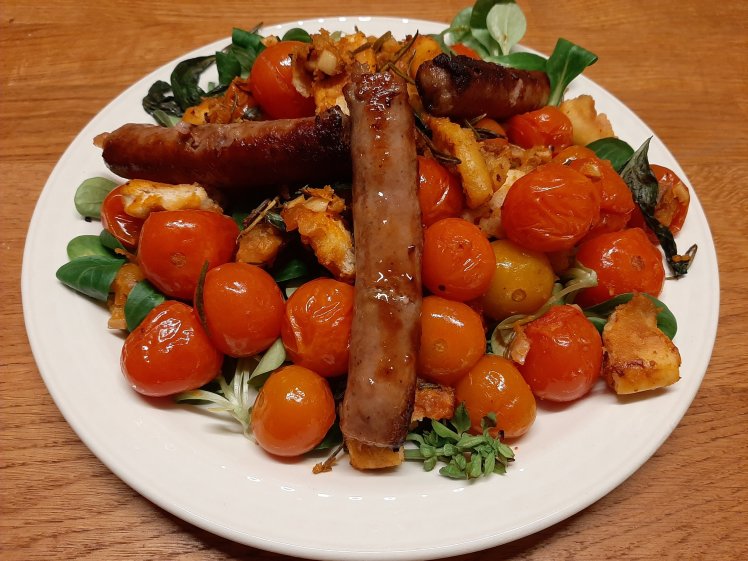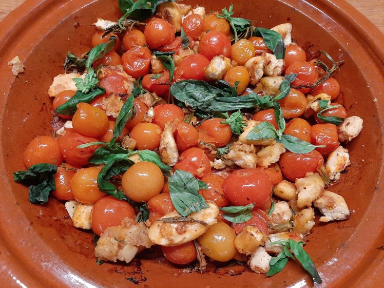 Panzanella is a typical Italian dish, based on tomatoes and bread. My version is, of course, a little different, but with the same ingredients.The warm tomato salad will be served with some grilled fish for Iris, and some Italian sausages for me.Wash 800 grams of cherry tomatoes. Remove the stems. Put them in a large oven dish. Add 125 grams of older bread cubes, 4 chopped garlic cloves, a few stems of fresh rosemary and a drizzle of olive oil. Mix everything. Put the dish in the oven at 150° for approximately 1, 1 1/2hour. Stir halfway and add 2 table spoons of red wine vinegar. Once ready, spread fresh basil, salt, lots of black pepper and rocket or dandelion salad.Serve with some fish or meat, or even without, as lunch.