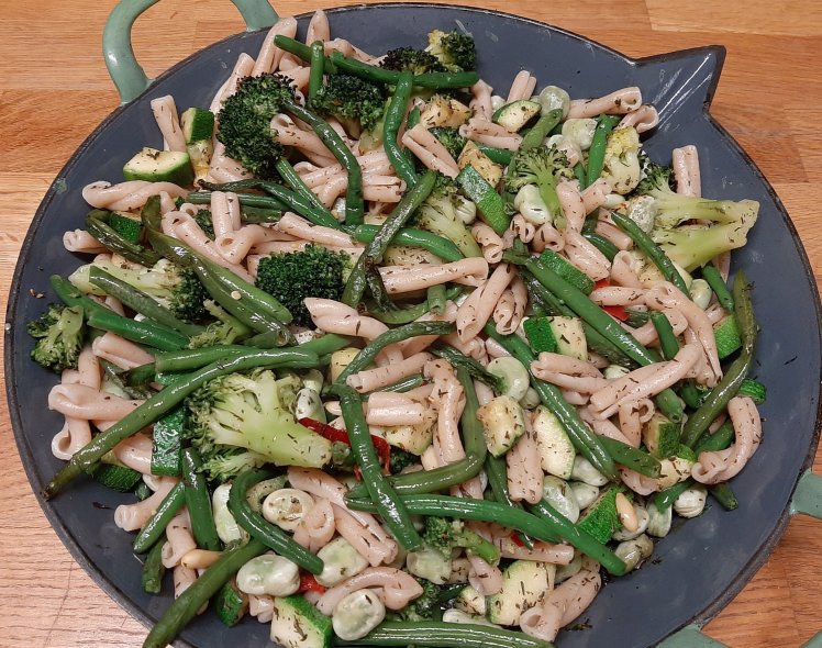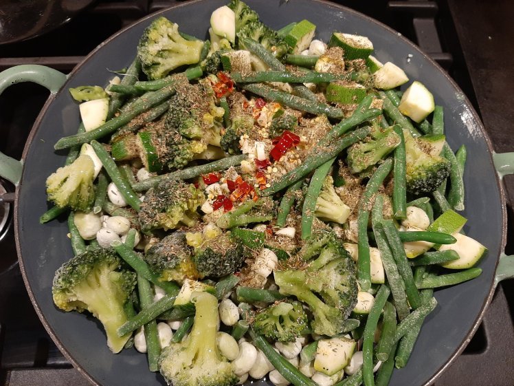 Put a mixture of frozen beans, green beans and broccoli in an oven dish. Add 1 chopped courgette, 4 chopped garlic cloves, chili flakes, 1 table spoon of dried thyme and 2 table spoons of pine nuts. Finish with a drizzle of olive oil and mix. Bake in the oven at 180° for approximately 30 mins. Stir halfway.