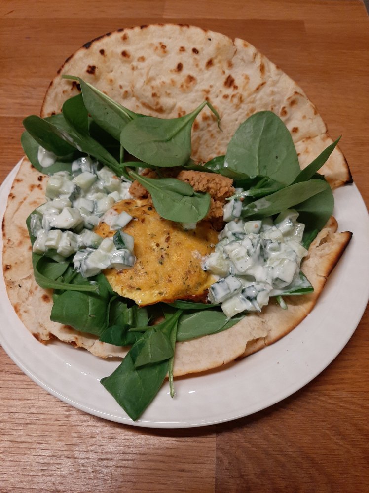 Chop 1 cucumber in tiny cubes. Mix with 170 grams of Greek yogurt and 1 finely chopped garlic clove. Mix, add pepper, salt, a few chopped mint leaves, a drizzle of lemon juice and a little drizzle of olive oil.