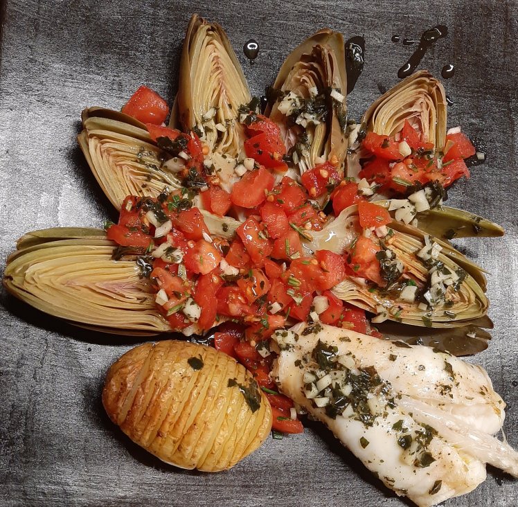 ‘Greens that taste like friendship’, what a beautiful book of Seppe Nobels, a Belgian cook known for his recipes with vegetables.Baby artichokes with pistou of tomatoes is awesome, as starter or in combination with fish/meat and oven baked potatoes.For 2p, clean 8 baby artichokes by removing the outer leaves and the skin of the stem. I prefer to cook them in salted water with a glass of white wine, some bay leaves, 1/2 of a lemon and some rough sea salt. Cook for approximately 15 mins, until ready.In the meanwhile, remove the skin of 5 small tomatoes ( make a cross incision, cover with boiling water).Chop in small cubes. Mix with 2 table spoons of white balsamic vinegar, 1 chopped garlic clove, 2 table spoons of chopped fresh rosemary, black pepper and salt.Cut the artichokes in halves. Spread on a plate. Spread some of the tomatoes.Heat 50 ml of olive oil. Add 3 table spoons of chopped fresh (or frozen) basil. Finish your plate with the basil oil.Delicate flavor, beautiful cooking.