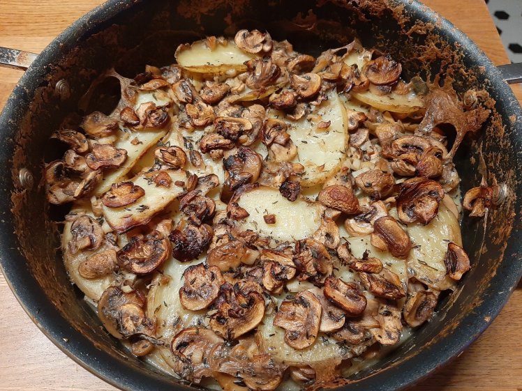 Put 300 ml of semi skimmed milk and 50 ml of white wine in a pan ( good for oven and fire). Add 1 table spoon of thyme, and some salt. Spread 500 grams of unpeeled potatoes cut in slices. Heat the fire and allow to simmer for approximately 5 mins.Melt 20 grams of butter in a pan. Add 4 chopped garlic cloves and 600 grams of thinly sliced mushrooms. Bake for a few minutes.Add the mushrooms to the pan with potatoes. Stir gently in order to mix everything. Add lots of black pepper and some salt if needed. Spread some butter. Bake in the oven at 180° for approximately 45 mins.Serve with fish or chicken and a green salad with mustard vinaigrette.
