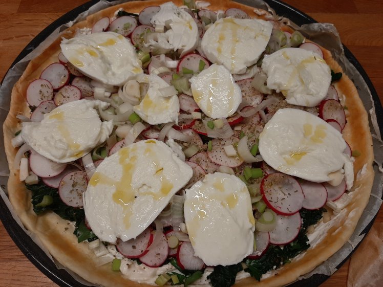 Spread 2 chopped spring onions. Finish with 200 grams of mozzarella, pepper, olive oil and dried oregano.