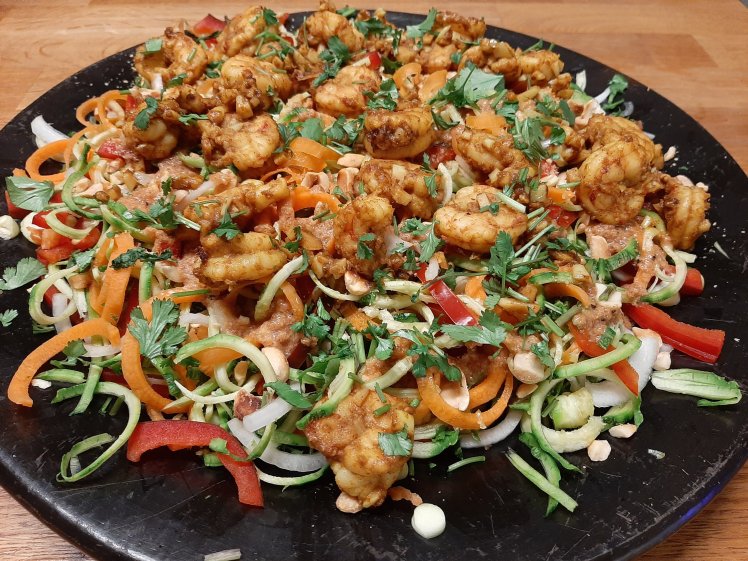 I have an impressive amount of kitchen equipment, although certain tools I rarely use. A spiralizer is one of those things. It creates lovely vegetable curls, but ( mine is for sure) it’s not really handy. I must admit that this salad would be less attractive without.Marinate 300 grams of defrosted and dried scampi in 2 teaspoons of curry powder, 4 chopped garlic cloves, 1/2 teaspoon of paprika powder, 1 teaspoon of four spices mixture ( cinnamon, nutmeg, ginger and clove), 1 teaspoon of mustard and 4 teaspoons of olive oil for approximately 15 mins.Use the spiralizer to cut 3 large carrots and 3 medium sized young courgettes put on a large plate. Slice 1 bell pepper and 1 fresh ( sweet) onion thinly.Roast 2 table spoons of unsalted peanuts in a dry pan. Grind.For the dressing, mix the juice of 1 lemon with 2 teaspoons of peanut butter, 1 teaspoon of sesame oil and a pinch of salt.Bake the scampi with the marinade.Spread the nuts, the scampi and dressing on the vegetables. Finish with chopped fresh coriander.