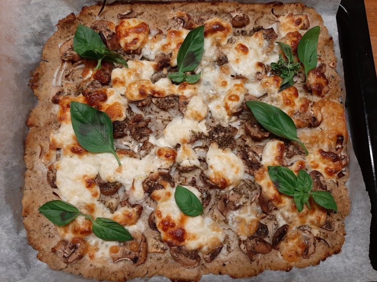Chop and bake 1 onion, 300 grams of mushrooms, 4 chopped garlic cloves in a drizzle of olive oil. Add dried basil, pepper and salt. Spread on the pizza. Finish with mozzarella. Bake for another 15-20mins. Finish with fresh basil.