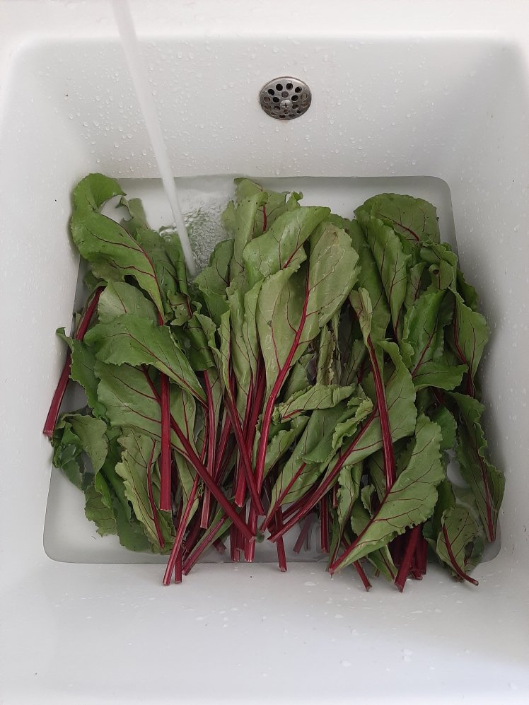 Chop 2 large leeks in pieces of 1-2 cm. Put in a buttered oven dish. Add pepper, salt, 1 table spoon of dried basil and a drizzle of olive oil. Bake in the oven at 180° for 20 mins. Chop the fresh leaves of 8 beetroots (used in the recipe a few days ago). Heat a pan. Add a drizzle of olive oil. Bake the leaves with 4 chopped garlic cloves.