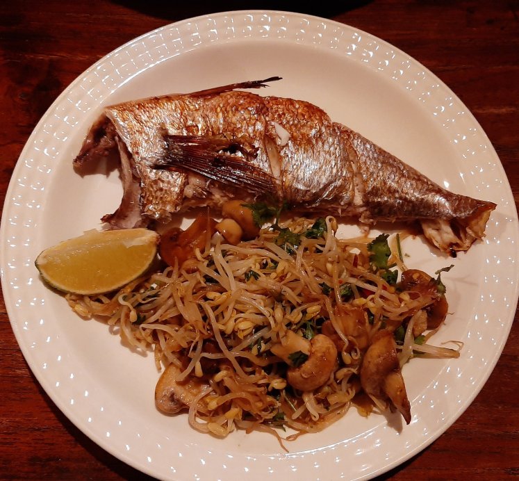 Ask the fish monger to clean the fish if you don’t want to do it yourself (less smelly garbage 😉). Make a few deep incisions in the body. Marinate the fish in ready made teriyaki sauce during approximately 30 mins (turn halfway). Put a few slices of lemon in the tummy. Bake in the oven at 180° for 25-30 mins.