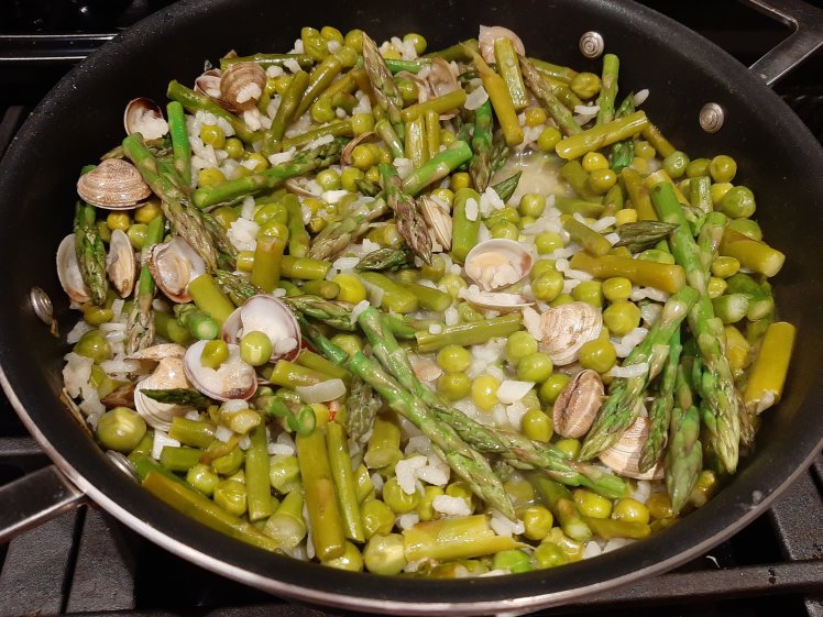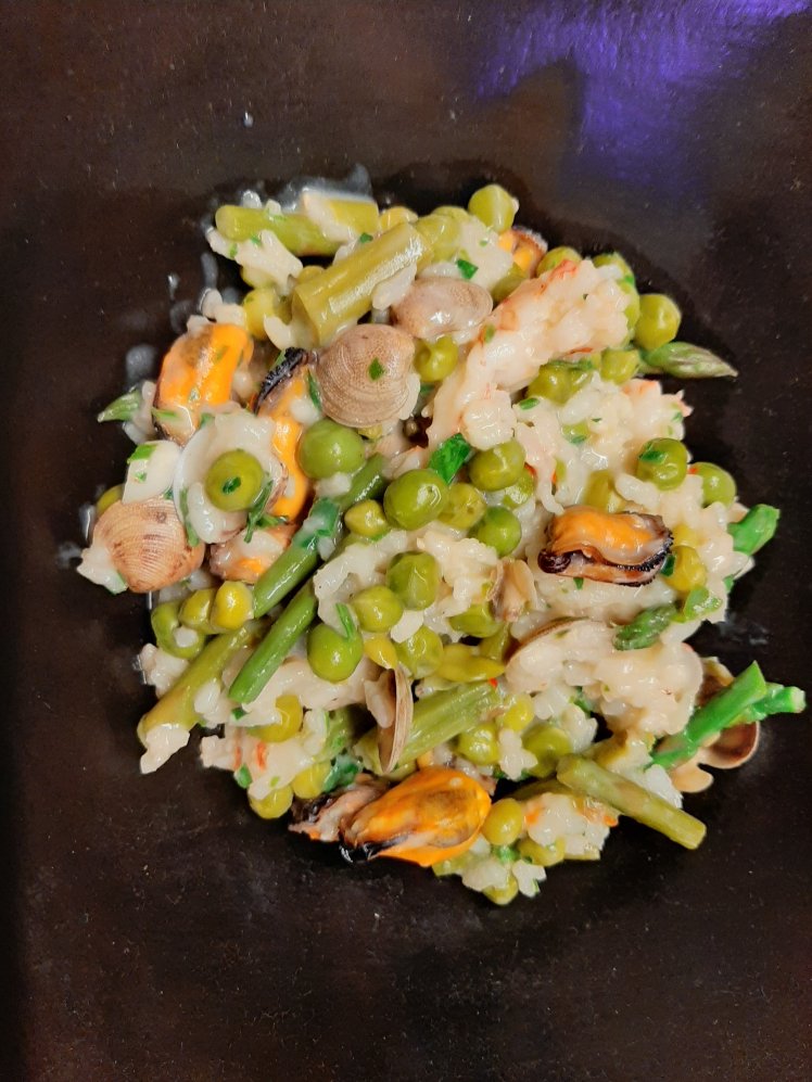 Thanks to my visit to the big supermarket we have some fresh seafood for a primavera risotto.