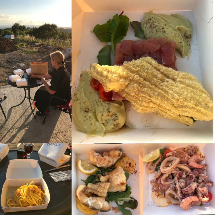 Our local restaurant AnonimaX has a weekly fish menu. Let’s try his take away offer and enjoy our first dinner on our almost finished terrace.