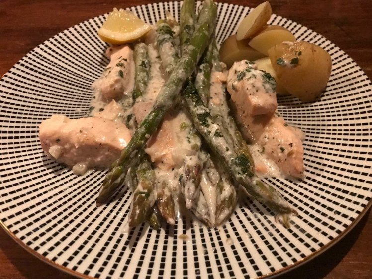 Add 100 ml of white wine. Allow the wine to evaporate. Add 200 ml of soy cream. Allow to simmer for approximately 20 minutes, until the asparagus are al dente. Taste the sauce, add pepper and salt. During the last minutes, spread some fresh salmon. Finish with fresh parsley and some steamed potatoes.