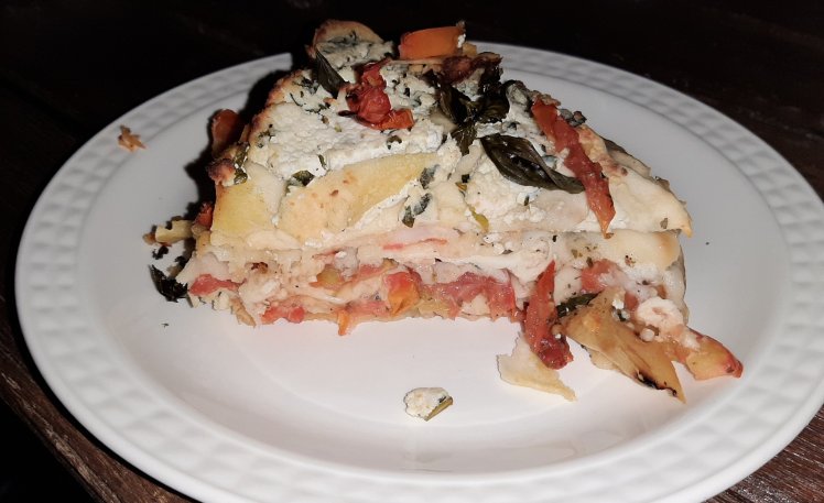 Carta musica is a Sardinian crispy flat bread. You need 250 grams for this recipe. You also need 1 kilo of tasty tomatoes, thinly sliced, 2 buffalo mozzarella of 200 grams, thinly sliced, fresh basil, 200 grams of ricotta, balsamic vinegar, olive oil, dried basil and oregano, pepper and salt. Use a large springform. Spread same cling film in a way you can cover the food after preparing. Start with a tin layer of carta musica which you can easily break to create 1 layer. Continue with a layer of tomatoes, pepper, salt, dried oregano and a drizzle of balsamic vinegar, Cover with carta musica. Create a layer with mozzarella, dried basil, pepper and salt. Cover with carta musica and repeat with tomatoes, … Finish with carta musica. Cover with the cling film and put in the fridge for 1 night. Mix 200 grams of ricotta with pepper, salt and chopped fresh basil. Store in the fridge. 30 minutes before arrival, remove the circle of the springform, remove the upper part of the cling film. Cover with a large plate and turn upside down. Remove bottom and cling film. Spread the ricotta cheese, some extra basil leaves and a drizzle of olive oil. This portion is enough for 6-8 persons as lunch. A leftover is an easy, quick dinner for 2, baked in the oven at 180° for 25-30 mins.