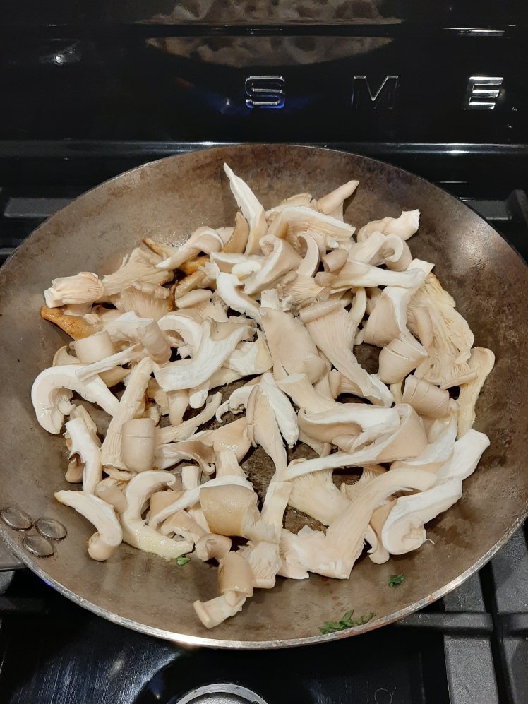 Bake 200 grams of oyster mushrooms crispy in some butter. Put aside.
