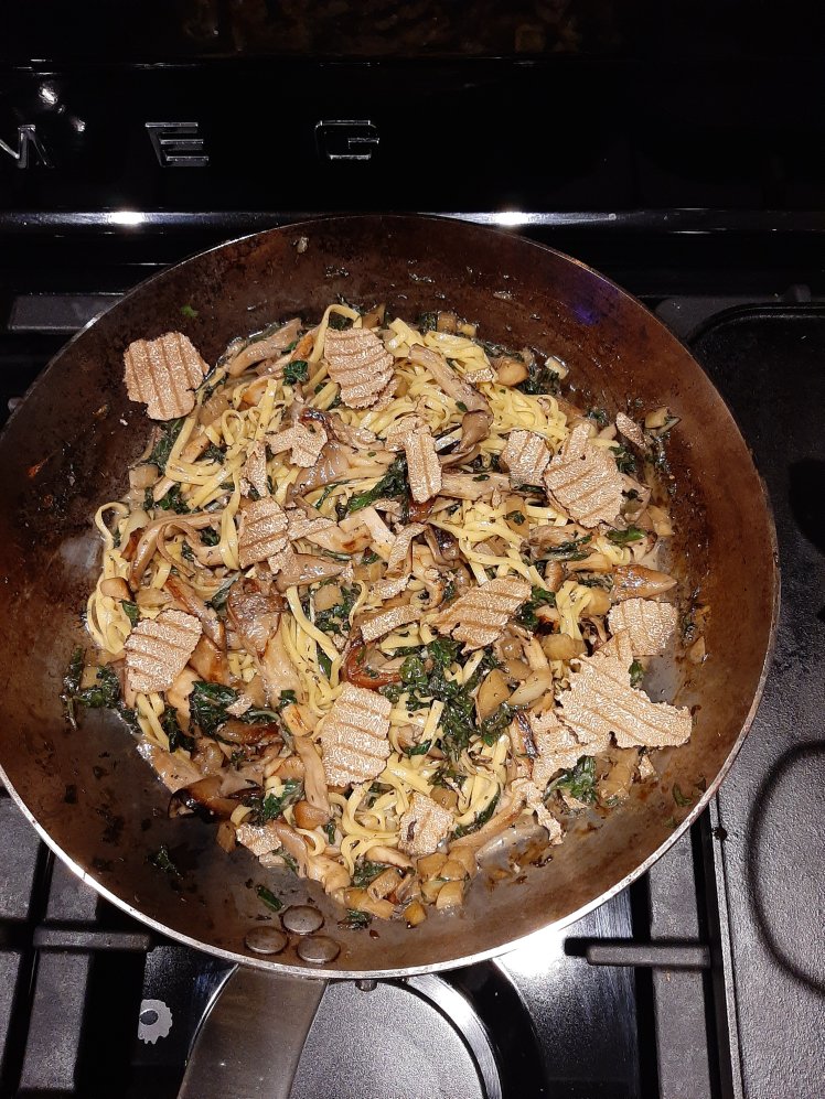 Clean 400 grams of swiss chard. Chop and fry 2 cloves of aglione (or normal garlic)in a drizzle of olive oil. Add the swiss chard. Add some thyme. Stir and fry for 15-20 mins. Add pepper, salt and some cream. Mix with the mushrooms.Boil some paste al dente. Mix everything. Finish with ….grated summer truffle.
