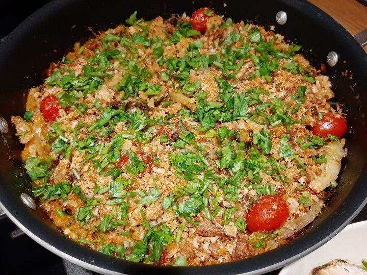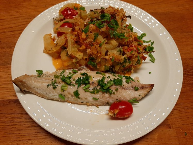 For a side dish for 2p, wash and slice 2 medium sized fennels. Chop and fry 4 garlic cloves in a drizzle of olive oil. Add the fennel. Fry and stir. Add a few fresh thyme stems, pepper and salt. After almost 20 minutes, spread 250 grams of cherry tomatoes, 125 ml of lowfat cream. Allow to simmer for approximately 15 mins more. Cover the dish with a mixture of 80 grams of old bread crumb and 40 grams of grated parmesan. Spread a drizzle of olive oil. Bake in a preheated oven at 200° for approximately 15-20 mins until golden brown. Finish with fresh parsley. We had some simple ovenbaked mackerel as proteins.