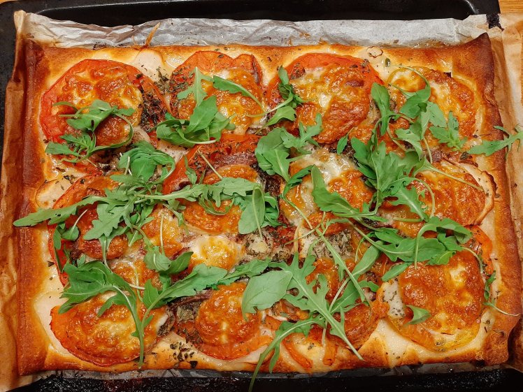 Spread the dough on baking paper on an oven tray. Spread some olive oil and sundried oregano. Spread thinly sliced beautiful tomatoes. Spread 4 chopped garlic cloves and 1 sliced fresh onion. Season with dried oregano, pepper and salt. Spread the anchovies of a small can. Spread some thinly sliced mozzarella. Finish with the oil of the anchovies. Bake in the oven at 180° for 20 mins. Serve with fresh arugula. Easy, late night candlelight dinner.😘