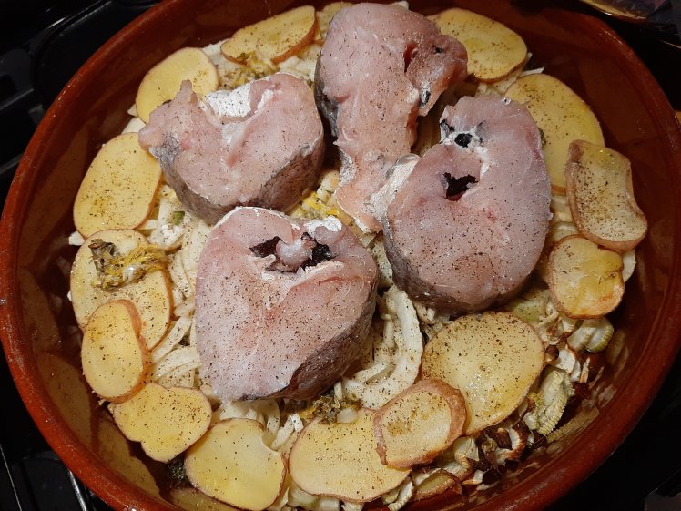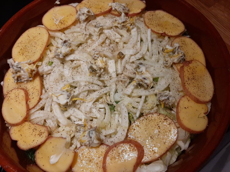 Wash and slice 400 grams potatoes thinly. Slice 2 fennel bulbs thinly. Spread the potatoes and fennel in a large oiled oven dish.