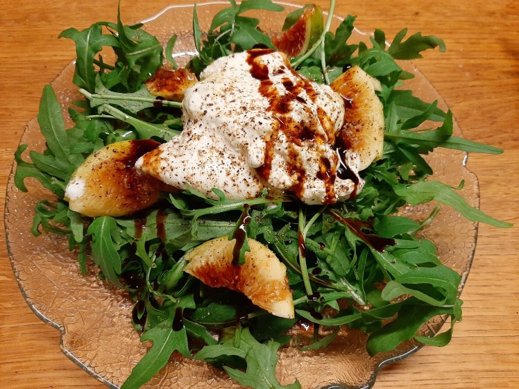 There are still fresh figs to collect. Our guests have never eaten fresh figs, so let’s try to maximize their flavor in an easy starter.Spread some arugula on each dish. Cut a few figs in quarters and spread 4-6 quarters on each plate. Spread some lucious burrata. Season with pepper and salt. Finish with a drizzle of good olive oil and old balsamic vinegar. Simple awesome Italian food.