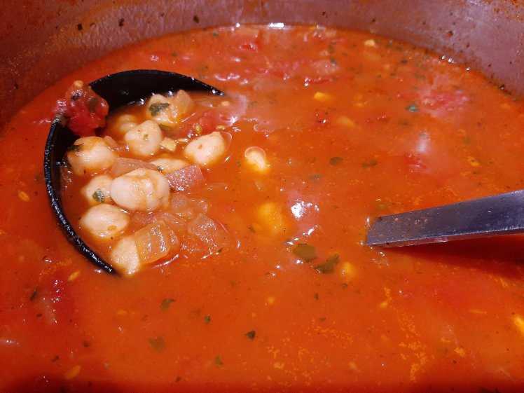 Harira is the typical soup during the Ramadan. My version is a vegetarian version. Chop and fry 2 onions and 4 garlic cloves in a drizzle of olive oil for a few minutes. Add 2 teaspoons of cumin, 2 teaspoons of paprika powder, 2 bay leaves and 800 grams of canned tomatoes. Stir and allow to simmer. Add 2 cans of water. Allow to simmer for approximately 20 minutes. Add some vegetal stock powder. Taste, add pepper and salt. Add pepper and salt. Add 2 cans of drained chickpeas towards the end. Finish with fresh coriander or fresh parsley if you can’t find coriander.